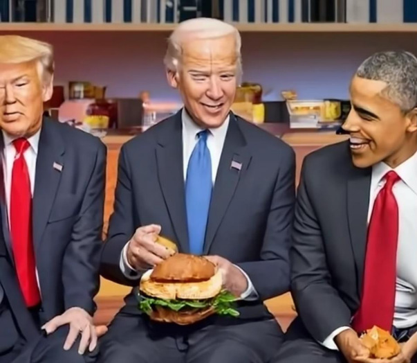 Donald Trump, Joe Biden et Barack Obama partageant un hamburger et s'amusant
