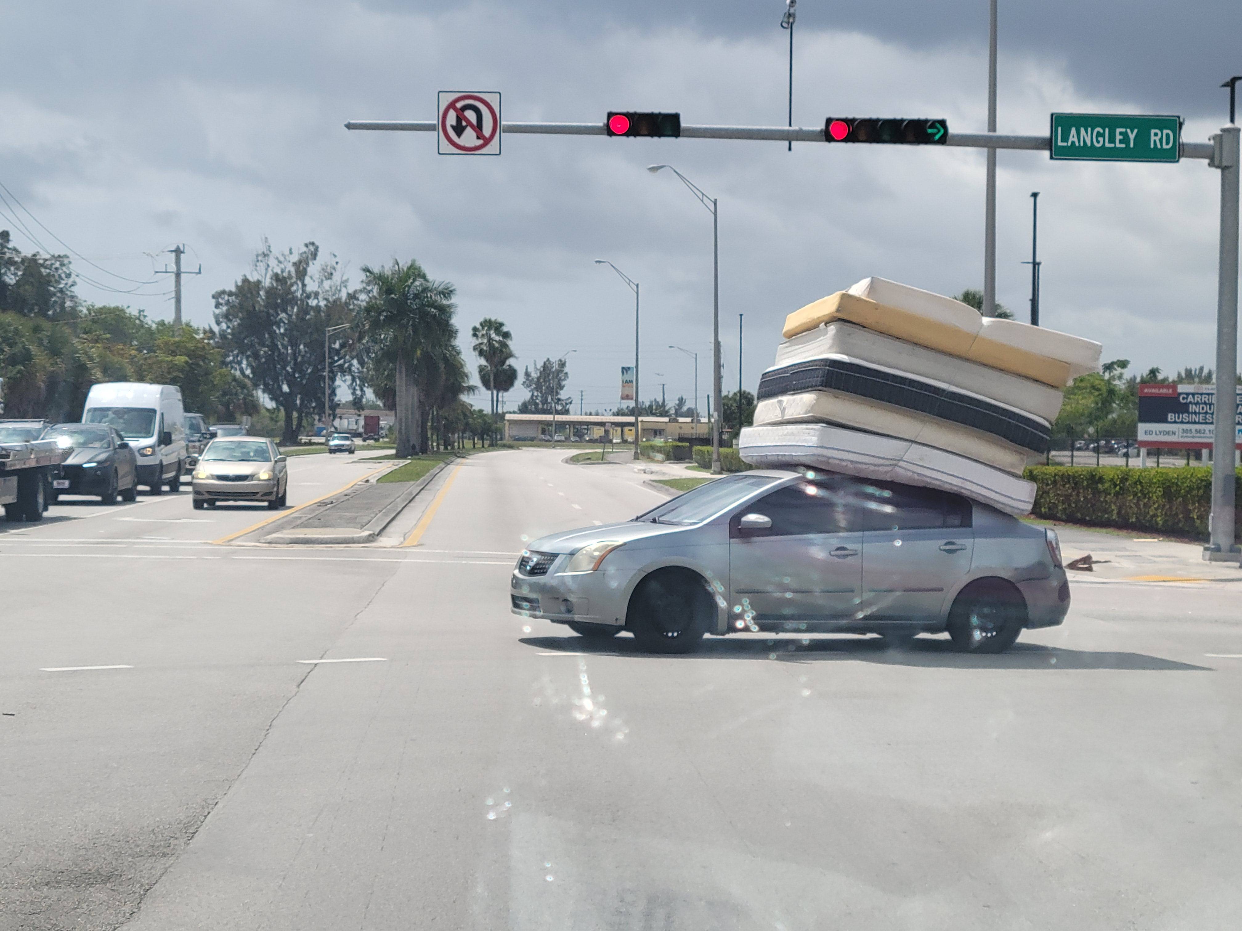 - voiture avec des matelas superposés sur le toit