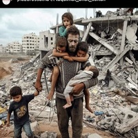 Ce contexte de guerre correspond aux éléments plastiques et iconiques présents sur l’image ; le bâtiments en ruine serait donc le produit d’un bombardement aérien qui s’est abattu sur la ville. La famille marchant vers la personne qui prend la photographie fuient ce paysage de guerre, ils en sont les victimes, on le voit par leur visage couverts de poussière, leur mines démunies ainsi que l’absence de chaussures ou de bagages. La présence du drapeau palestinien à côté de l’emoji coeur brisé (?) laisse à penser que la famille présente sur l’image est une famille palestinienne victime des bombardements israélien à l’encontre de la Palestine. Ces éléments iconiques et plastiques visent, comme on l’a vu, à inspirer de la tristesse, de la compassion ou encore de la pitié envers ces enfants fuyant la guerre et envers ce père sauveur qui fuient les décombres. De plus, le fait qu’il n’y ait pas énormément d’éléments iconiques et plastiques vise à faire passer un message, en effet cette absence d’éléments démontrent que cette famille n’a plus rien, même plus de chaussures. Le fait de ne plus rien avoir correspond au contexte de la guerre, ici, la guerre israélo-palestinienne.