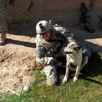 Il s'agit d'une photographie en couleur au format paysage d'un soldat se trouvant au centre de l’image. Ce soldat est accroupi en tenue complète de combat à côté d’un chien. Ce chien au pelage blanc et marron est assis à côté du soldat.