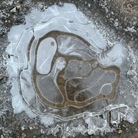 cellules, des bulles ou des éléments organiques microscopiques. La texture apparente dans la photo est la glace, avec des bulles emprisonnées à l'intérieur. La surface semble à la fois lisse et texturée, renforçant l'illusion de voir quelque chose de microscopique. La présence de cailloux et de terre gelée autour de la flaque crée un cadre naturel, délimitant visuellement la zone observée. Cette configuration rappelle effectivement l'image d'un échantillon écrasé entre deux plaques, avec des éléments environnants semblables à un contour, ce qui renforce l'analogie avec un échantillon observé au microscope. Les couleurs que l’on peut observer comme le marron de la boue, le blanc et le gris de la glace, renforce cette illusion en rappelant des composants biologiques. La façon dont la lumière se reflète et est absorbée par les différentes parties de la flaque gelée met en valeur certains éléments et en dissimule d'autres. La disposition des formes circulaires et des bulles peut être interprétée comme une sorte de motif régulier, même si en réalité il s'agit d'une formation aléatoire due à la gelée. La flaque gelée constitue le sujet principal de la photo. Elle crée une illusion visuelle d'une cellule au microscope en raison de ses caractéristiques et de sa texture. Les bulles et la boue sous la surface gelée sont des détails visuels qui contribuent à la complexité de la texture et à la perception de détails microscopiques. Les ronds irréguliers donnent l'impression d'être interconnectés. L’eau présente sous la flaque donne l’impression de représenter des fluides biologiques. Les contours créés par les cailloux et la terre gelée donnent l'impression d'une structure contenue ou encadrée comme un échantillon pourrait être préparé pour une observation microscopique.