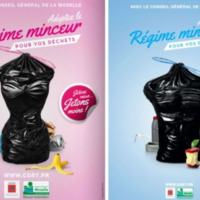 2 - Cette image est une publicité. Elle est donc immatérielle. On observe en premier lieu les couleurs. D’un côté un fond rose et de l’autre un fond bleu. Ces deux fonds, s’éclaircissent en leur centre. Du côté rose, au centre, on distingue un sac poubelle noir prenant la forme d’un corps féminin et du côté bleu, celui d’un corps masculin. Les deux formes de corps sont minces et athlétiques, dont les muscles et reliefs sont incarnés par les reflets plastiques de la matière du sac. Ces deux silhouettes sont, à leur base, entourées de déchets divers et variés, tels que : déchets alimentaires, déchets plastiques, déchets métalliques et déchets cartonnés. Les éléments figuratifs sont accompagnés de nombreux signes linguistiques. En effet, en haut nous avons la provenance de la campagne, juste en-dessous, le titre « Adoptez le régime minceur pour vos déchets » puis sur la droite le slogan, « Jetons mieux, jetons moins... ». Tout en bas de l’affiche, on trouve le lien pour accéder à un site et en-dessous, le sigle de la région de la Moselle ainsi qu’un autre. Les mots importants, choisis pour être voyants, sont mis en valeur par leur couleur. En effet, autre que le blanc pour trancher avec la couleur du fond, les mots, « régime » et « minceur » sont de la même couleur que ce dernier mais de manière beaucoup plus intense. « pour vos déchets » est aussi mis en valeur mais cette fois-ci en étant surligné d’une bande blanche, l’écriture correspondant elle aussi à la couleur du fond. Le slogan lui, est remarquable par sa forme de pastille autocollante de couleur soit rose soit bleu. A part la première phrase, les autres textes sont inclinés et non alignés. Ils se superposent sur plusieurs lignes : trois pour le titre, quatre pour le slogan.