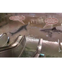 2 - Ainsi, comme évoqué, il s’agit pour ce texte visuel d’une photographie à laquelle a été ajoutée deux textes qui s’inscrivent dans l’esthétique des bandes dessinées. Au premier plan, quatre rampes d’escalator sont visibles et desservent un large espace inondé à hauteur d’une dizaine ou d’une vingtaine de centimètres. Au centre de la salle, deux requins, assez grands – entre deux et trois mètres de long, nagent. L’eau semble trouble en dépit des multiples lumières qui l’éclairent et qui créent de très nombreux reflets, parmi lesquels se devinent entre autres des écrans et des devantures de boutique. Elle pourrait même être qualifiée de sale, voire plus précisément de boueuse, bien qu’elle ne charrie ni déchets, ni débris, ni éléments particuliers.