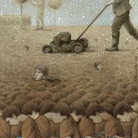 nd plan, on voit des têtes dépasser de « sol » et un homme tondant de « l’herbe ».