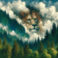 En conclusion, cette œuvre joue habilement avec la tromperie visuelle en présentant des nuages en forme de lion au cœur d'une forêt en montagne. La disposition centrale et la symbolique riche évoquent la puissance de la nature, incitant à réfléchir sur notre relation avec l'environnement et soulignant l'urgence de sa préservation.