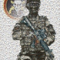 L'image est une mosaïque en forme de soldat de la BOPE qui est composée de plusieurs image, chacune portant un sens en rapport avec le cas de la BOPE :