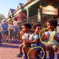 C'est en continuant avec le plan central que les erreurs commises par l'IA commencent à être identifiables. Les IA sont connues produire des images plutôt réussies en termes de décors, d'environnements comme peut le témoigner l'arrière-plan de cette image. La bibliothèque et la façade du bâtiment sont plutôt réussis. Il en est cependant autrement concernant les éléments humains, leurs visages et leurs doigts en particulier. Au plan central se trouvent trois passants et les trois présentent des irrégularités. Le premier passant possède trois jambes dont l'une a une chaussure sans chaussette, l'extrémité de celle du milieu disparaît et la troisième a une chaussure avec chaussette. Est-ce qu'il porte une jupe ? Un short ? Est-ce qu'il tient une poussette ? Une canne pour personnes malvoyantes ? Tout se mélange et il est impossible de comprendre l'image. Le second passant a un visage plus que douteux, ses yeux ne semblent pas définis, son sourire n'est pas très réussi et il tient ce qui semble être une laisse mais sans chien au bout. Le dernier passant a une coiffure très structurée, une épaule légèrement déboîtée et un de ses pieds a disparu. Au premier plan, l'enfant du milieu a sa main gauche qui fait un signe avec son index et son auriculaire qui ne semble pas du tout adapté à la situation, et son pied droit n'est pas fini, il n'y a pas de chaussure. Pour finir les chaussettes de l'enfant sur la droite semblent se confondre avec ses chaussures. Toutes ces erreurs confirment l'utilisation de l'IA et sa défaillance en termes de caractéristiques humaines.
