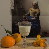 Au premier plan nous voyons un verre de lait rempli avec à gauche du verre des clémentines et à droite du verre une rose de couleur jaune-orange, si le spectateur regarde attentivement et uniquement le premier plan il ne pourra comprendre l’effet recherché. Mais si nous regardons attentivement l’arrière-plan nous pouvons observer que le célèbre tableau « La laitière » de Johannes Vermeer y figure, cet arrière-plan rempli de symbole culturel permet de mieux comprendre l’effet que nous avons voulu transmettre aux spectateurs car si nous prenons du recul sur la photographie nous pouvons observer très attentivement grâce à l’angle de la prise de la photo et du cadrage minutieusement choisi que la laitière verse du lait dans le verre étant en train de se remplir. Mais aussi grâce au positionnement du plateau qui permet de rajouter une perspective trompant notre œil, néanmoins l’effet recherché n’aurait pas pu être efficace s’il existé une profondeur de champ.