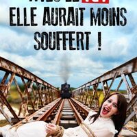 Au premier plan, une femme allongée de manière tragique sur les rails de train, devient le point focal de l'image. Ses membres sont habilement liés aux rails par une corde qui accentue la vulnérabilité de la femme, créant un lien inextricable entre sa personne et le destin ferroviaire qui se profile. Le visage de la femme démontre aussi sa souffrance.