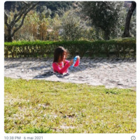 Au plan iconique, à l'arrière-plan nous apercevons beaucoup de végétations avec essentiellement des arbres ayant plusieurs nuances de vert plus ou moins foncé et une haie se situant le long d’un chemin ou d’une route pavée. Sur cette route se trouve une jeune fille vêtue d’un t-shirt rose à manches longues, elle semble occupée avec un téléphone portant une coque bleu ( peut être représentant stitch un animal imaginé de dessin animé), mais l’on ne voit pas ses jambes et c’est par ailleurs le sujet de cette photo.