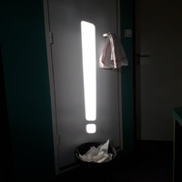 2 - Il s’agit d’une photographie prise à l’aide d’un téléphone portable. La photo est assez sombre, laissant en évidence un trait de lumière semblant former un point d’exclamation. Il y a un contraste fort entre ce trait de lumière et le reste de la pièce. Ce trait de lumière se positionne au dessus d’une poubelle, directement sur une porte. On peut apercevoir un torchon blanc et rouge suspendu à la poignée de cette dernière. Le trait de lumière est au centre de l’image, tout le contour de l’image est sombre.