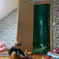 Dans l’image trompe l'œil que j’ai créé, on voit un enfant en train de jouer dans sa chambre. La particularité est qu’il y a une porte mystérieuse qui donne l’impression de mener à un autre monde, cette porte mystérieuse est notre élément trompe l'œil car elle ajoute un contraste entre la réalité et l’imaginaire.