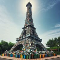 Symbole emblématique de la France, la Tour Eiffel représente l'histoire, la culture et l'identité de la France. Construire la Tour Eiffel à partir de déchets crée une tension sémantique en com-binant des symboles de grandeur avec des matériaux associés au rejet et au gaspillage. La poubelle, symbole du gaspillage et de la consommation, ajoute une dimension sémantique en évoquant des thèmes tels que la surconsommation, la gestion des déchets et la durabilité.