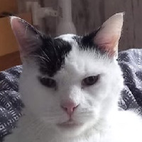 Cette image est une photographie en format 4:3. Elle comporte un chat dont la tête et la base du corps sont visibles. Au dessus de sa tête, on distingue une lampe semblant être un chapeau posé sur la tête du chat. Le chat est installé sur une couverture. La photographie a été prise presque en face du coin d'une pièce, comme le montre la table de nuit vue perpendiculairement au mur, et sur laquelle est attachée la lampe servant de chapeau au chat.