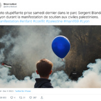 Au plan linguistique, l’image ne contient pas d’image excepté son titre en légende « Le garçon au ballon ». Ce titre nous donne plus d’informations sur l’identité du personnage au centre de l’image et mets l’accent sur le ballon. D’un autre côté le cadre contient un corps de texte contenant des éléments qui nous donnent plusieurs informations sur le contexte de l’image. D’abord, le texte indique que la photo a soi-disant été prise « samedi dernier » soit 7 jours avant la publication du post sur twitter le samedi 2 décembre. Le texte mentionne que le lieu de la photographie serait le parc Sergent Blandan qui est situé en plein centre de la ville de Lyon en France. On apprend ensuite que le cliché aurait été pris durant une manifestation de soutien aux civiles palestiniens. D’autre part, l’image trompeuse contient des éléments tels que des mots-dièse (#), codes des réseaux sociaux, et des indications visuelles sur la date de publication, le nombre de vu, les commentaires etc.