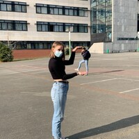 2 - Cette photographie est une image en couleur où est situé au centre une femme et dans sa main, plus exactement derrière elle, se trouve un homme. Ce dernier n’est pas dirigé dans la même direction que l’autre personne présente sur la photographie et n’est pas sur la même ligne d’horizon. La femme se tient de côté vers la droite, tête dirigée vers la photographe, porte un jean bleu et un haut noir puis un masque chirurgical sur le visage. Quant à lui, il est dirigé vers la gauche, tête baissée, il porte également un jean bleu et un haut de couleur noir.