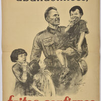 L’image transmet un message précis : « Populations abandonnées, faites confiance au soldat allemand ! ». Celui-ci est appuyé par le dessin afin de convaincre le destinataire. Le message s’adresse directement à des populations abandonnées, et lorsque l’on connaît le contexte historique, en prenant en compte aussi que le texte soit écrit en français, on se rend compte que l’affiche s’adresse à la population française et plus précisément celle présente en zone occupée qui a été abandonnée par le gouvernement et laissée aux mains de l’Allemagne nazie. En effet, les populations vivants dans la zone occupée étaient dans l’obligation de cohabiter avec les soldats allemands, et cette affiche de propagande va dans ce sens, on veut convaincre ces personnes de faire confiance aux Allemands. Il y a un message connoté derrière cette affiche. Le dessin montre un soldat allemand s’occupant d’enfants qui semblent être heureux à ces côtés, il met en perspective la place prise par le soldat allemand comme un bon père de famille, celui qui vient remplacer celui qui les a abandonnés et que leur présence procure une joie. De plus, le fait que l’enfant mange une tartine en souriant tout en étant dans les bras du soldat ne semble pas anodin et rejoint cette interprétation, car le soldat l’a nourri et le porte comme pour démontrer qu’il prend soin de lui. Les autres enfants semblent regarder avec envie le petit garçon dans ses bras, ainsi cela donne l’impression que le destinataire de l’image peut y voir une nouvelle perspective de vie après ce changement important au sein du pays qui suit la capitulation de la France pendant la seconde guerre mondiale.