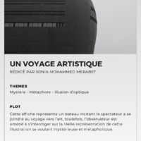 L'image est une affiche en noir et blanc invitant le spectateur à un voyage artistique.