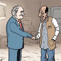 Il y a deux hommes qui se serrent la main au centre de l'image. Le premier homme, à gauche, est chauve avec des cheveux gris sur les côtés et porte un costume bleu avec une chemise blanche et une cravate rouge. Il a une moustache grise et semble avoir un air satisfait ou content. Le second homme, à droite, a une calvitie avancée avec des cheveux noirs sur les côtés, un grand nez et un sourire très large. Il porte un gilet gris par-dessus une chemise bleue avec une cravate bleue plus claire, un pantalon de couleur foncée et un badge ou une étiquette sur son gilet, qui peut indiquer son nom ou sa fonction.