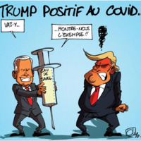 Cette juxtaposition suggère une critique de la perception populaire du vaccin, amplifiée par les préoccupations sur sa rapidité de développement. À droite de l'image, Trump est dépeint avec des signes visuels d'énervement : joues rouges, bras le long du corps, poings serrés. Des gribouillages au-dessus de sa tête suggèrent une perte momentanée de clarté mentale due à la colère. Le titre en haut de l'image, "Trump positif au Covid...", indique un événement clé lié à la santé de Trump. Au-dessus de la tête de Bush, des phrases telles que "Vas-y" et "Montre nous l'exemple" créent un dialogue cynique, soulignant la critique de Bush envers Trump et mettant en lumière l'absurdité de la situation.