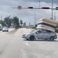 7 - En conclusion, l'image représentant une voiture grise avec des matelas superposés circulant