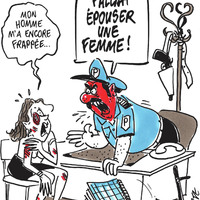caricature effectuée par le célèbre journal satirique français « Charlie Hebdo », basé sur la dénonce ironique des violences conjugales et de l'action des autorités à ce sujet.