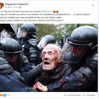 ● « Ça te fait jouir de faire fracasser les citoyens #Macron ? Ce pauvre retraité qui pense à ses enfants en manifestant pacifiquement ! … Et après certains viendront chialer pour une poubelle en feu ou une vitrine cassée ! Partagez pour montrer ce que Macron a fait de notre Démocratie ! » : description qu’a donné Dégageons l'oligarchie
