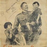 L'image est une affiche de propagande nazie. On voit un allemand avec un enfant dans ses bras et un enfant qu'il tient par la main. On voit écris sur l'affiche "Populations abandonnées, faites confiance au soldat allemand".
