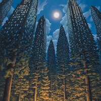 La grandeur des arbres nous donne une impression que l’homme est tout petit. Les fenêtres des bâtiments allumées donne une impression que le travail ne cesse jamais car la nuit elles devraient être éteintes.