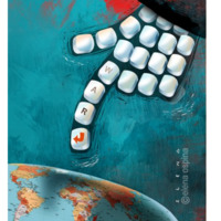 L’image contient des symboles visuels chargés de sens, tels que la main au sein de la laquelle se trouve des touches de clavier, le mot « War » ainsi que le globe.