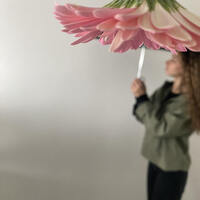 La photo présente une femme tenant un parapluie en forme de fleur, symbolisant la résilience et la positivité. La pluie, représentant les préjugés et les critiques, est suggérée par des éléments flous. La netteté de la plante contraste avec la femme, soulignant sa force face aux défis. Le positionnement décentré et le format portrait ajoutent une dimension personnelle à cette représentation visuelle des enjeux sociaux liés aux femmes.