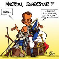 Enfin, la légende de la caricature qui indique « Macron, superstar? » laisse entendre que c’est grâce à ce mélange d’idée qu’Emmanuel Macron gagne en popularité auprès des Français. C’est en effet l’objectif du candidat aux présidentielles, satisfaire le plus possible d’électeurs. Cet argument est appuyé par la présence des bulles qui font dire à la caricature du politicien « Normal… …Avec moi tout le monde s’y retrouve ! ». Cependant la posture et l’expression du visage est assez étrange, on dirait qu’il n’est pas honnête dans ses paroles, comme si ce qu’il était en train de dire était en réalité un moyen pour tromper l’opinion publique sur ses idées réelles. Les yeux clos et le demi sourire qu’il arbore font penser à une expression qu’un menteur pourrait faire pour tenter de convaincre son auditoire. Les yeux fermés peuvent en effet représenter quelqu’un qui feint l’ignorance, le dessinateur fait de la caricature une personne qui fait semblant de penser quelque chose, le personnage de Macron avance ses propos comme s’il était évident que ses idées rassemblent tout le monde. Nous pouvons appuyer cet argument par la posture de Macron, notamment ses bras qui sont levés au niveau des hanches, les paumes tournées vers le ciel qui est une posture qu’on fait quand une chose nous semble logique.
