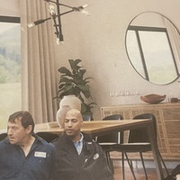 Au centre de l'image on a un meuble en bois sur lequel est posé des verres, un vases également en verres et un saladier en bois. A gauche de ce meuble se situe une plante verte, à droite de celui ci se trouve une grande lampe également en bois. Enfin, sur le mur sur lequel est posé le meuble, on y retrouve au centre un miroir apportant de la lumière comme la baie vitrée, et a droite un petit miroir, ou l'on aperçoit quelqu'un de dos avec un couteau.