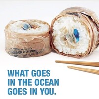 Repas représentant des sushis avec des baguettes asiatiques, le repas est entouré de plastique afin de sensibiliser la population sur la dégradation des fonds marins
